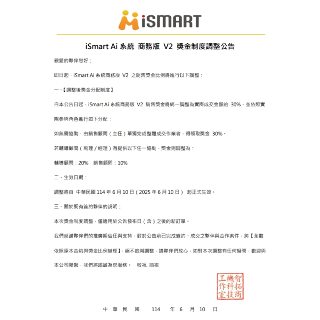 20250610 iSmart Ai系統商務版V2 用到飽獎金制度公告